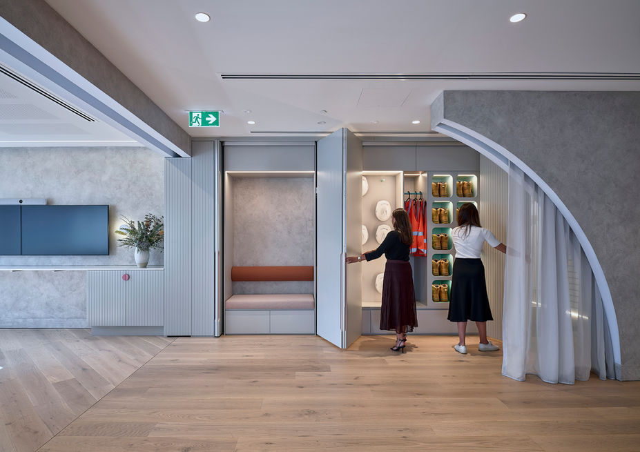 Designed by alkimi studio, the space is welcoming and inspiring, creating an optimal environment for successful leasing engagements. The space is dominated with dramatic architectural curves emulating Sydney’s new metro line tunnels whilst the entry/prep area can be hidden with custom joinery.